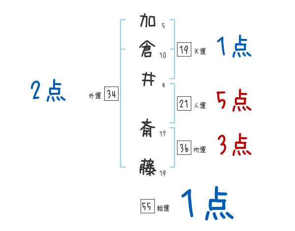 人運![]() | 加倉井斎藤さんの人運は21画の5つ星!統率力がある。独立し成功する。名誉を手に入れる。 性格や才能などを表す2番目に重要な運勢です。人間関係や協調性、社会的な成功に影響します。主に20歳から50歳ぐらいまでの中年期の運勢を表します。 |