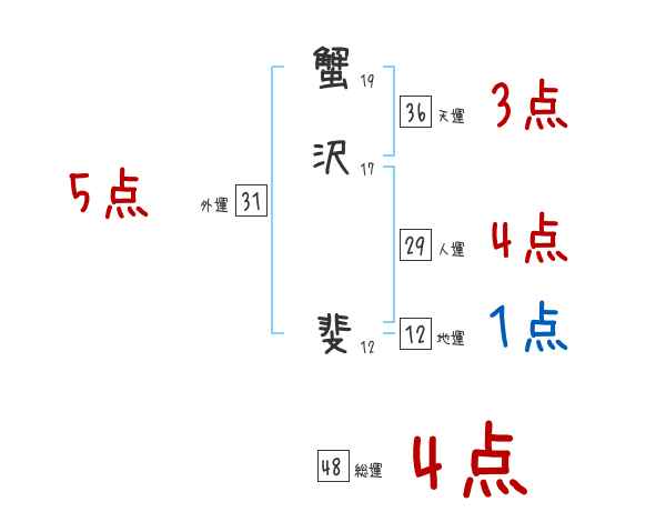 天運![]() | 蟹沢斐さんの天運は36画の3つ星!先見性が豊かです。多少神経質で苦労することも。 家系が持つ宿命的な運勢を表します。祖先から受け継いだ苗字ですので自分の力が及びません。家柄を象徴します。 |