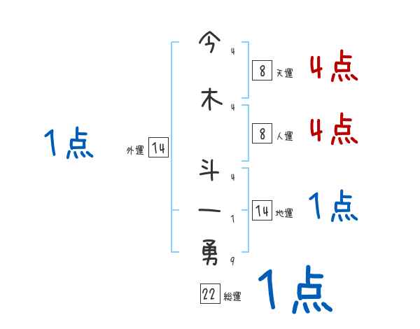 天運![]() | 今木斗一勇さんの天運は8画の4つ星!勤勉家。根気強く努力し成功する。忍耐力がある。 家系が持つ宿命的な運勢を表します。祖先から受け継いだ苗字ですので自分の力が及びません。家柄を象徴します。 |