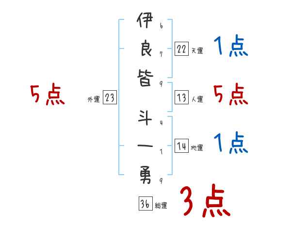 総運![]() | 伊良皆斗一勇さんの総運は36画の3つ星!先見性が豊かです。多少神経質で苦労することも。 あなたの人生を表す1番重要な運勢です。生涯を通じて影響する総合運となり、主に50歳以降の晩年期に影響を及ぼします。 |
