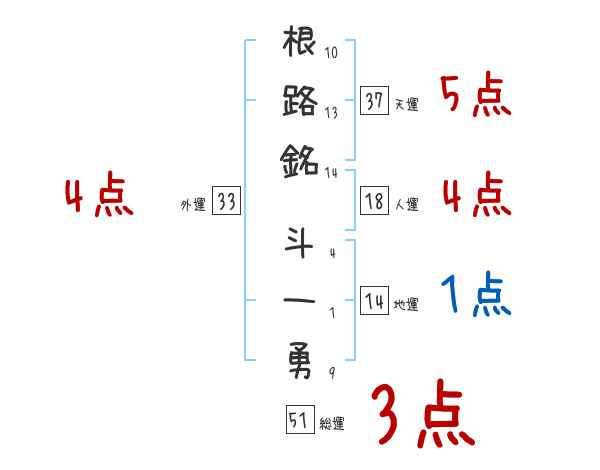 根路銘斗一勇さんの画数の鑑定結果
