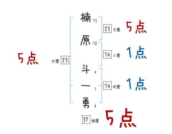 天運![]() | 楠原斗一勇さんの天運は23画の5つ星!想像力に優れ活力がある。一代で成功し名誉を手に入れる。 家系が持つ宿命的な運勢を表します。祖先から受け継いだ苗字ですので自分の力が及びません。家柄を象徴します。 |