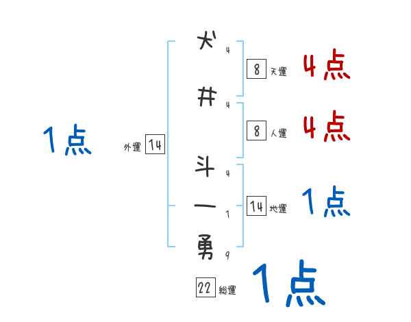 天運![]() | 犬井斗一勇さんの天運は8画の4つ星!勤勉家。根気強く努力し成功する。忍耐力がある。 家系が持つ宿命的な運勢を表します。祖先から受け継いだ苗字ですので自分の力が及びません。家柄を象徴します。 |