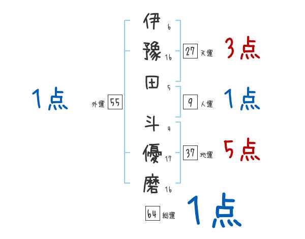 地運![]() | 伊豫田斗優磨さんの地運は37画の5つ星!努力家で順応性に優れる。現実的な考え方ができ忠実に物事をこなす。 個性を表す基礎的な運勢です。性格形成や対人関係、行動力など家庭環境に影響されます。主に誕生してから20歳くらいまでの若年期の運勢を表します。 |