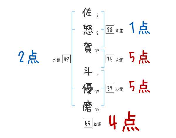 天運![]() | 佐怒賀斗優磨さんの天運は28画の1つ星!家庭環境に注意。スポーツで活躍できる能力があるかも。 家系が持つ宿命的な運勢を表します。祖先から受け継いだ苗字ですので自分の力が及びません。家柄を象徴します。 |