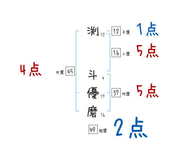 人運![]() | 渕斗優磨さんの人運は16画の5つ星!人望が厚く大きく発展する。逆転成功が見える。 性格や才能などを表す2番目に重要な運勢です。人間関係や協調性、社会的な成功に影響します。主に20歳から50歳ぐらいまでの中年期の運勢を表します。 |