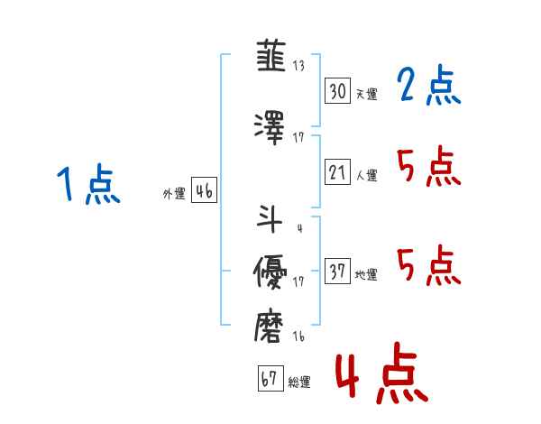 天運![]() | 韮澤斗優磨さんの天運は30画の2つ星!浮き沈みの激しさに注意しましょう。 家系が持つ宿命的な運勢を表します。祖先から受け継いだ苗字ですので自分の力が及びません。家柄を象徴します。 |