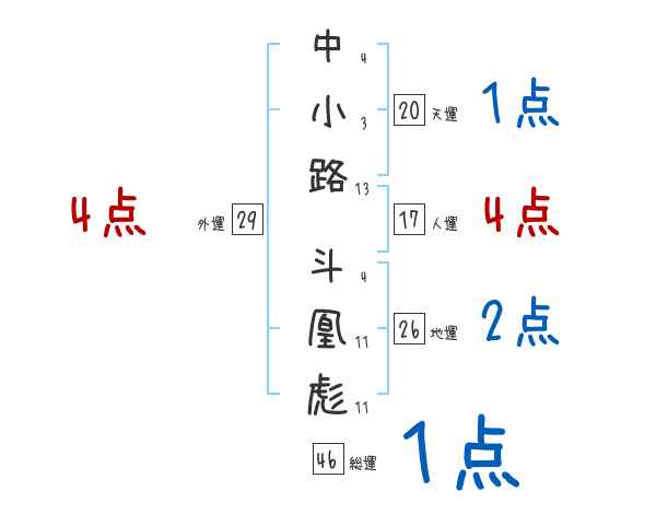 外運![]() | 中小路斗凰彪さんの外運は29画の4つ星!完全主義で才能がある。厳格な心の持ち主。 生活面を象徴する運勢です。外部から受ける影響力を表し、結婚運、家庭運や職場、環境への順応性を表します。 |