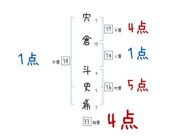 天運![]() | 宍倉斗史希さんの天運は17画の4つ星!積極的な行動力。地位を気づき財産を手に入れる。純粋な心と直感力。 家系が持つ宿命的な運勢を表します。祖先から受け継いだ苗字ですので自分の力が及びません。家柄を象徴します。 |