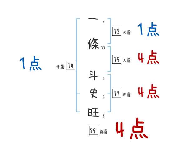 天運![]() | 一條斗史旺さんの天運は12画の1つ星!簡単な失敗で諦めてしまいやすいかも。着実に行動すると良いでしょう。 家系が持つ宿命的な運勢を表します。祖先から受け継いだ苗字ですので自分の力が及びません。家柄を象徴します。 |