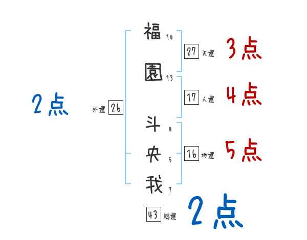 外運![]() | 福園斗央我さんの外運は26画の2つ星!波瀾万丈かも。信頼できる人を大事にしましょう。 生活面を象徴する運勢です。外部から受ける影響力を表し、結婚運、家庭運や職場、環境への順応性を表します。 |