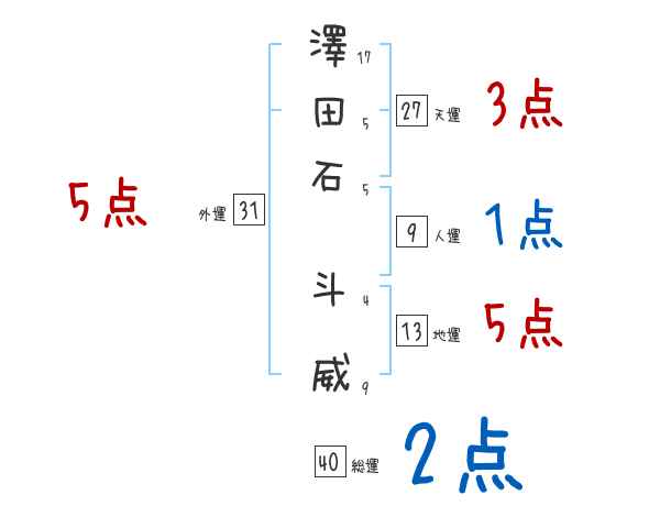 外運![]() | 澤田石斗威さんの外運は31画の5つ星!社交性があり判断力に優れる。順風満帆な人生で円満な生活。 生活面を象徴する運勢です。外部から受ける影響力を表し、結婚運、家庭運や職場、環境への順応性を表します。 |