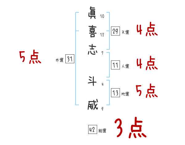 天運![]() | 眞喜志斗威さんの天運は29画の4つ星!完全主義で才能がある。厳格な心の持ち主。 家系が持つ宿命的な運勢を表します。祖先から受け継いだ苗字ですので自分の力が及びません。家柄を象徴します。 |