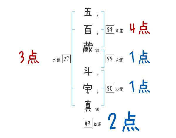 天運![]() | 五百蔵斗宇真さんの天運は29画の4つ星!完全主義で才能がある。厳格な心の持ち主。 家系が持つ宿命的な運勢を表します。祖先から受け継いだ苗字ですので自分の力が及びません。家柄を象徴します。 |