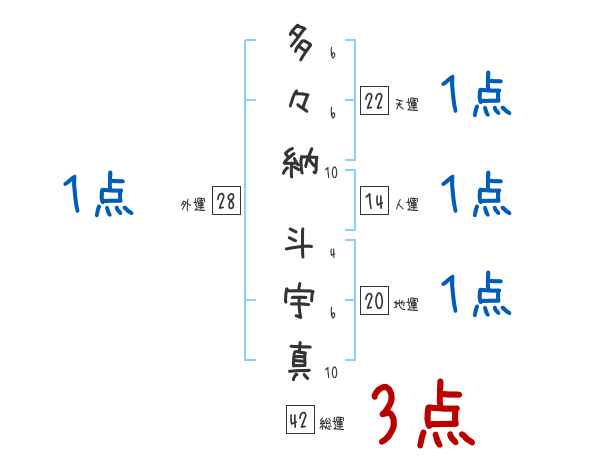 総運![]() | 多々納斗宇真さんの総運は42画の3つ星!病気に注意。多芸であるが消極的でおとなしい。 あなたの人生を表す1番重要な運勢です。生涯を通じて影響する総合運となり、主に50歳以降の晩年期に影響を及ぼします。 |