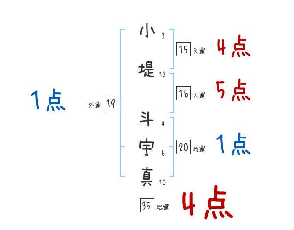 外運![]() | 小堤斗宇真さんの外運は19画の1つ星!優れた才能を持ちますが、協調性が足りないことも。周りの人と協力する事を意識しましょう。 生活面を象徴する運勢です。外部から受ける影響力を表し、結婚運、家庭運や職場、環境への順応性を表します。 |