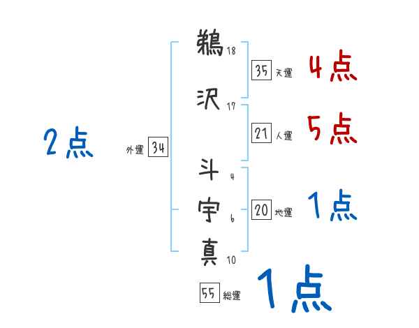 天運![]() | 鵜沢斗宇真さんの天運は35画の4つ星!温厚な性格で感受性が高い。穏和な性格で人望が厚い。 家系が持つ宿命的な運勢を表します。祖先から受け継いだ苗字ですので自分の力が及びません。家柄を象徴します。 |