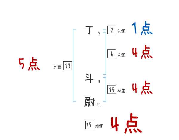 外運![]() | 丁斗尉さんの外運は13画の5つ星!才能に恵まれ人気がある。名声を手に入れる。円満な人生。 生活面を象徴する運勢です。外部から受ける影響力を表し、結婚運、家庭運や職場、環境への順応性を表します。 |
