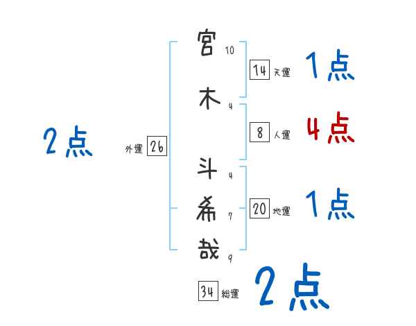 外運![]() | 宮木斗希哉さんの外運は26画の2つ星!波瀾万丈かも。信頼できる人を大事にしましょう。 生活面を象徴する運勢です。外部から受ける影響力を表し、結婚運、家庭運や職場、環境への順応性を表します。 |