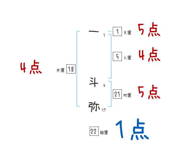 天運![]() | 一斗弥さんの天運は1画の5つ星!行動力、指導力があり出世し繁栄する。幸運に恵まれる。 家系が持つ宿命的な運勢を表します。祖先から受け継いだ苗字ですので自分の力が及びません。家柄を象徴します。 |