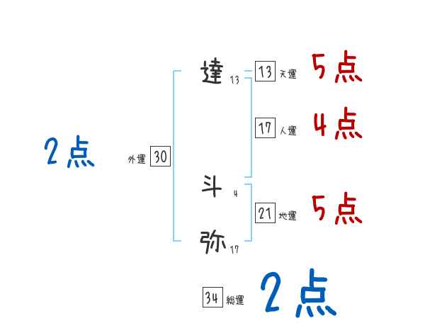 総運![]() | 達斗弥さんの総運は34画の2つ星!独創性に優れるが、自尊心が強く災難に注意しましょう。 あなたの人生を表す1番重要な運勢です。生涯を通じて影響する総合運となり、主に50歳以降の晩年期に影響を及ぼします。 |