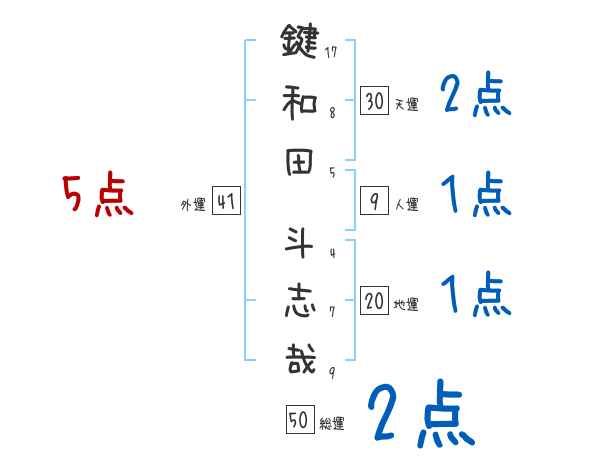 総運![]() | 鍵和田斗志哉さんの総運は50画の2つ星!浮き沈みが激しく不安定。しりすぼみに衰退しやすいので注意しましょう。 あなたの人生を表す1番重要な運勢です。生涯を通じて影響する総合運となり、主に50歳以降の晩年期に影響を及ぼします。 |