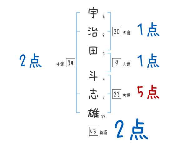 人運![]() | 宇治田斗志雄さんの人運は9画の1つ星!消極的で才能を発揮することが苦手なことも。周りの意見に耳を傾けましょう。 性格や才能などを表す2番目に重要な運勢です。人間関係や協調性、社会的な成功に影響します。主に20歳から50歳ぐらいまでの中年期の運勢を表します。 |