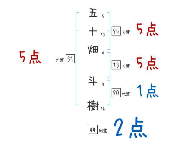 天運![]() | 五十畑斗樹さんの天運は24画の5つ星!家庭運が良く順調な人生。金運にも恵まれる。 家系が持つ宿命的な運勢を表します。祖先から受け継いだ苗字ですので自分の力が及びません。家柄を象徴します。 |