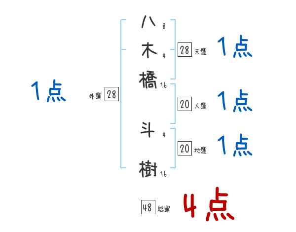 天運![]() | 八木橋斗樹さんの天運は28画の1つ星!家庭環境に注意。スポーツで活躍できる能力があるかも。 家系が持つ宿命的な運勢を表します。祖先から受け継いだ苗字ですので自分の力が及びません。家柄を象徴します。 |