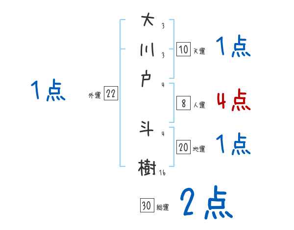 外運![]() | 大川戸斗樹さんの外運は22画の1つ星!努力することが苦手ないっぽう手先が器用。芸術性にも優れる。 生活面を象徴する運勢です。外部から受ける影響力を表し、結婚運、家庭運や職場、環境への順応性を表します。 |
