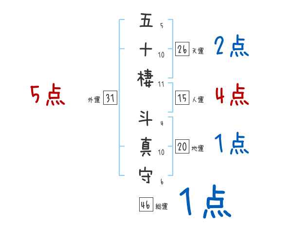 天運![]() | 五十棲斗真守さんの天運は26画の2つ星!波瀾万丈かも。信頼できる人を大事にしましょう。 家系が持つ宿命的な運勢を表します。祖先から受け継いだ苗字ですので自分の力が及びません。家柄を象徴します。 |