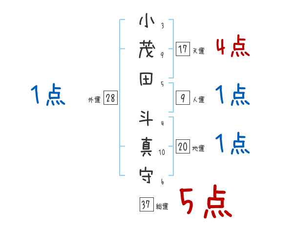 天運![]() | 小茂田斗真守さんの天運は17画の4つ星!積極的な行動力。地位を気づき財産を手に入れる。純粋な心と直感力。 家系が持つ宿命的な運勢を表します。祖先から受け継いだ苗字ですので自分の力が及びません。家柄を象徴します。 |