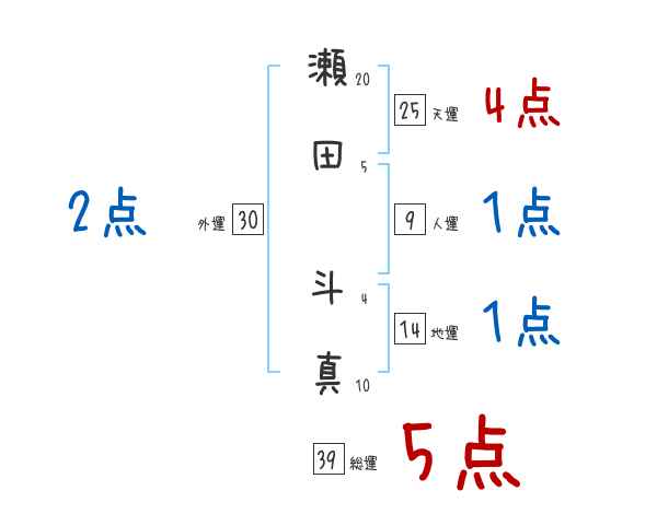 総運![]() | 瀬田斗真さんの総運は39画の5つ星!社交性に優れ人望が厚い。人の上に立ち成功する。 あなたの人生を表す1番重要な運勢です。生涯を通じて影響する総合運となり、主に50歳以降の晩年期に影響を及ぼします。 |