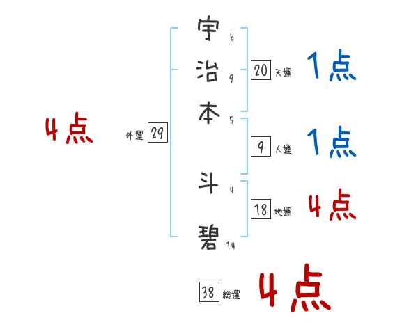 総運![]() | 宇治本斗碧さんの総運は38画の4つ星!温厚な性格で技術的な才能を発揮する。職人的な仕事に向いている。 あなたの人生を表す1番重要な運勢です。生涯を通じて影響する総合運となり、主に50歳以降の晩年期に影響を及ぼします。 |