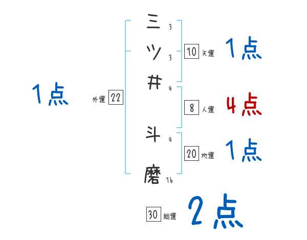 外運![]() | 三ツ井斗磨さんの外運は22画の1つ星!努力することが苦手ないっぽう手先が器用。芸術性にも優れる。 生活面を象徴する運勢です。外部から受ける影響力を表し、結婚運、家庭運や職場、環境への順応性を表します。 |