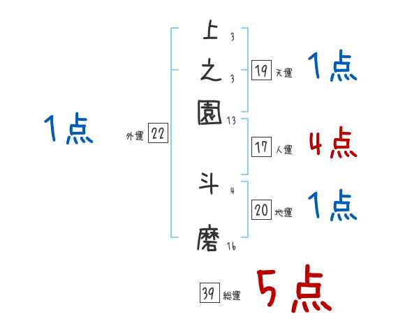 天運![]() | 上之園斗磨さんの天運は19画の1つ星!優れた才能を持ちますが、協調性が足りないことも。周りの人と協力する事を意識しましょう。 家系が持つ宿命的な運勢を表します。祖先から受け継いだ苗字ですので自分の力が及びません。家柄を象徴します。 |