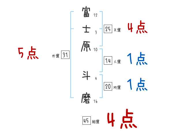 天運![]() | 富士原斗磨さんの天運は25画の4つ星!個性があり才能があふれる。強運の持ち主で発展する。 家系が持つ宿命的な運勢を表します。祖先から受け継いだ苗字ですので自分の力が及びません。家柄を象徴します。 |