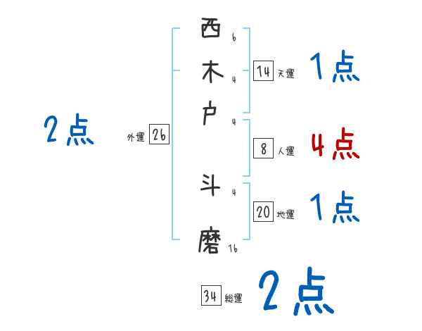 総運![]() | 西木戸斗磨さんの総運は34画の2つ星!独創性に優れるが、自尊心が強く災難に注意しましょう。 あなたの人生を表す1番重要な運勢です。生涯を通じて影響する総合運となり、主に50歳以降の晩年期に影響を及ぼします。 |