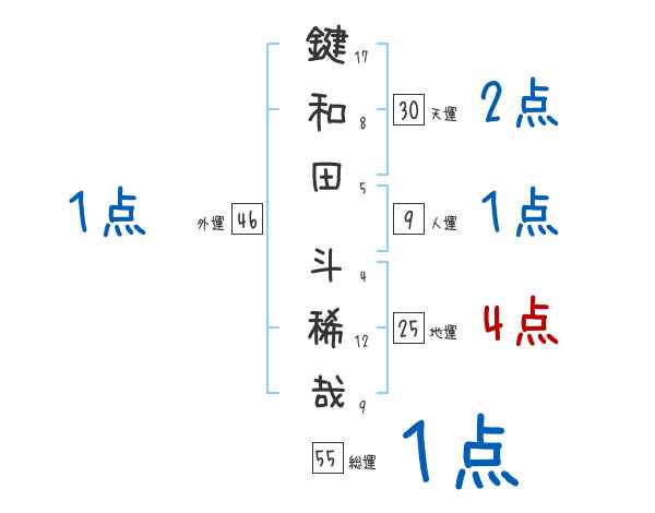 天運![]() | 鍵和田斗稀哉さんの天運は30画の2つ星!浮き沈みの激しさに注意しましょう。 家系が持つ宿命的な運勢を表します。祖先から受け継いだ苗字ですので自分の力が及びません。家柄を象徴します。 |