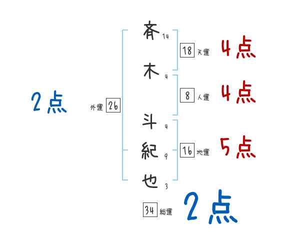 総運![]() | 斉木斗紀也さんの総運は34画の2つ星!独創性に優れるが、自尊心が強く災難に注意しましょう。 あなたの人生を表す1番重要な運勢です。生涯を通じて影響する総合運となり、主に50歳以降の晩年期に影響を及ぼします。 |