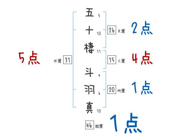 天運![]() | 五十棲斗羽真さんの天運は26画の2つ星!波瀾万丈かも。信頼できる人を大事にしましょう。 家系が持つ宿命的な運勢を表します。祖先から受け継いだ苗字ですので自分の力が及びません。家柄を象徴します。 |