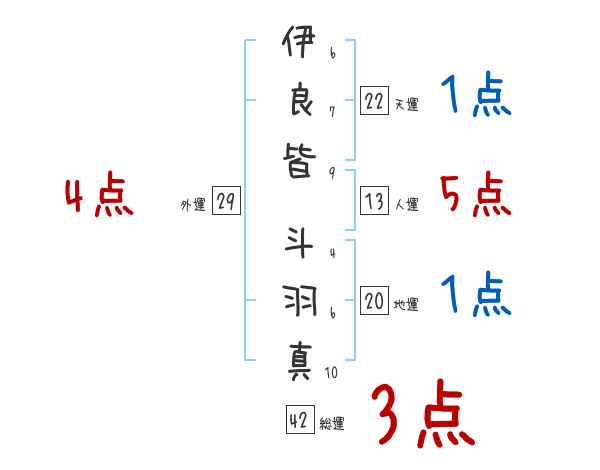 総運![]() | 伊良皆斗羽真さんの総運は42画の3つ星!病気に注意。多芸であるが消極的でおとなしい。 あなたの人生を表す1番重要な運勢です。生涯を通じて影響する総合運となり、主に50歳以降の晩年期に影響を及ぼします。 |