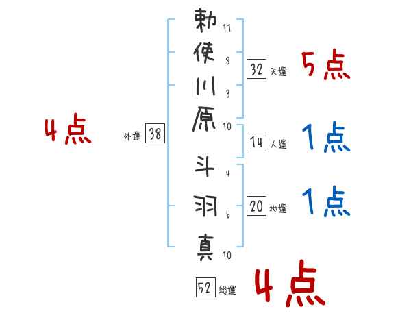天運![]() | 勅使川原斗羽真さんの天運は32画の5つ星!柔軟性があり成功する。チャンスが多く金運が良い。 家系が持つ宿命的な運勢を表します。祖先から受け継いだ苗字ですので自分の力が及びません。家柄を象徴します。 |