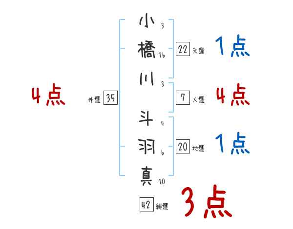 総運![]() | 小橋川斗羽真さんの総運は42画の3つ星!病気に注意。多芸であるが消極的でおとなしい。 あなたの人生を表す1番重要な運勢です。生涯を通じて影響する総合運となり、主に50歳以降の晩年期に影響を及ぼします。 |