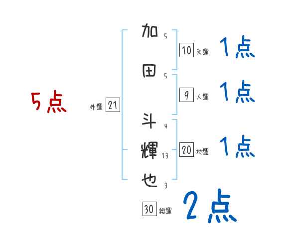 加田斗輝也さんの画数の鑑定結果