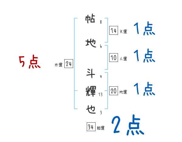 総運![]() | 帖地斗輝也さんの総運は34画の2つ星!独創性に優れるが、自尊心が強く災難に注意しましょう。 あなたの人生を表す1番重要な運勢です。生涯を通じて影響する総合運となり、主に50歳以降の晩年期に影響を及ぼします。 |