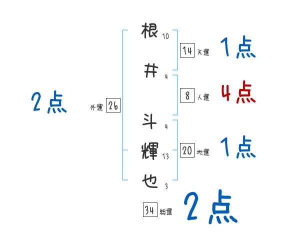 外運![]() | 根井斗輝也さんの外運は26画の2つ星!波瀾万丈かも。信頼できる人を大事にしましょう。 生活面を象徴する運勢です。外部から受ける影響力を表し、結婚運、家庭運や職場、環境への順応性を表します。 |