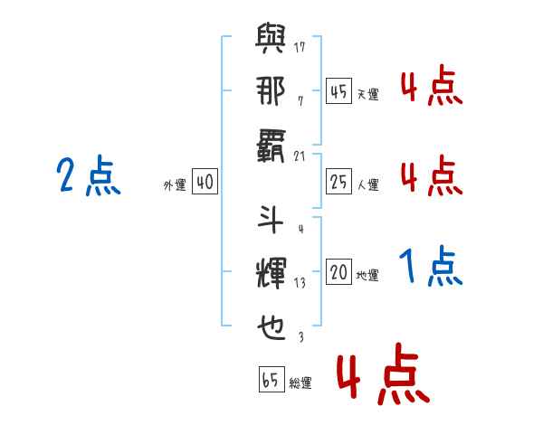 総運![]() | 與那覇斗輝也さんの総運は65画の4つ星!幸運に恵まれ繁栄する。包容力がある。 あなたの人生を表す1番重要な運勢です。生涯を通じて影響する総合運となり、主に50歳以降の晩年期に影響を及ぼします。 |