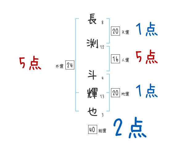 人運![]() | 長渕斗輝也さんの人運は16画の5つ星!人望が厚く大きく発展する。逆転成功が見える。 性格や才能などを表す2番目に重要な運勢です。人間関係や協調性、社会的な成功に影響します。主に20歳から50歳ぐらいまでの中年期の運勢を表します。 |
