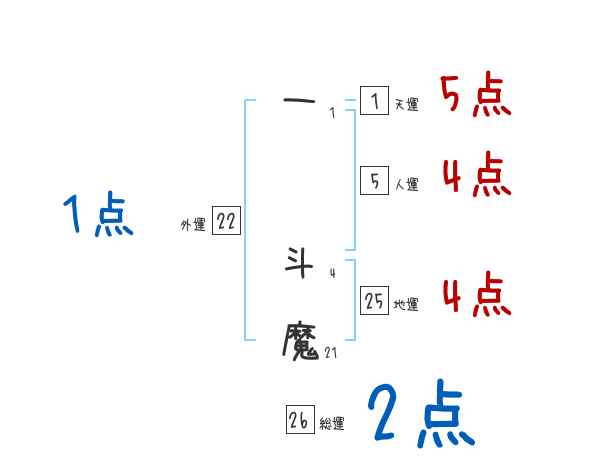 天運![]() | 一斗魔さんの天運は1画の5つ星!行動力、指導力があり出世し繁栄する。幸運に恵まれる。 家系が持つ宿命的な運勢を表します。祖先から受け継いだ苗字ですので自分の力が及びません。家柄を象徴します。 |
